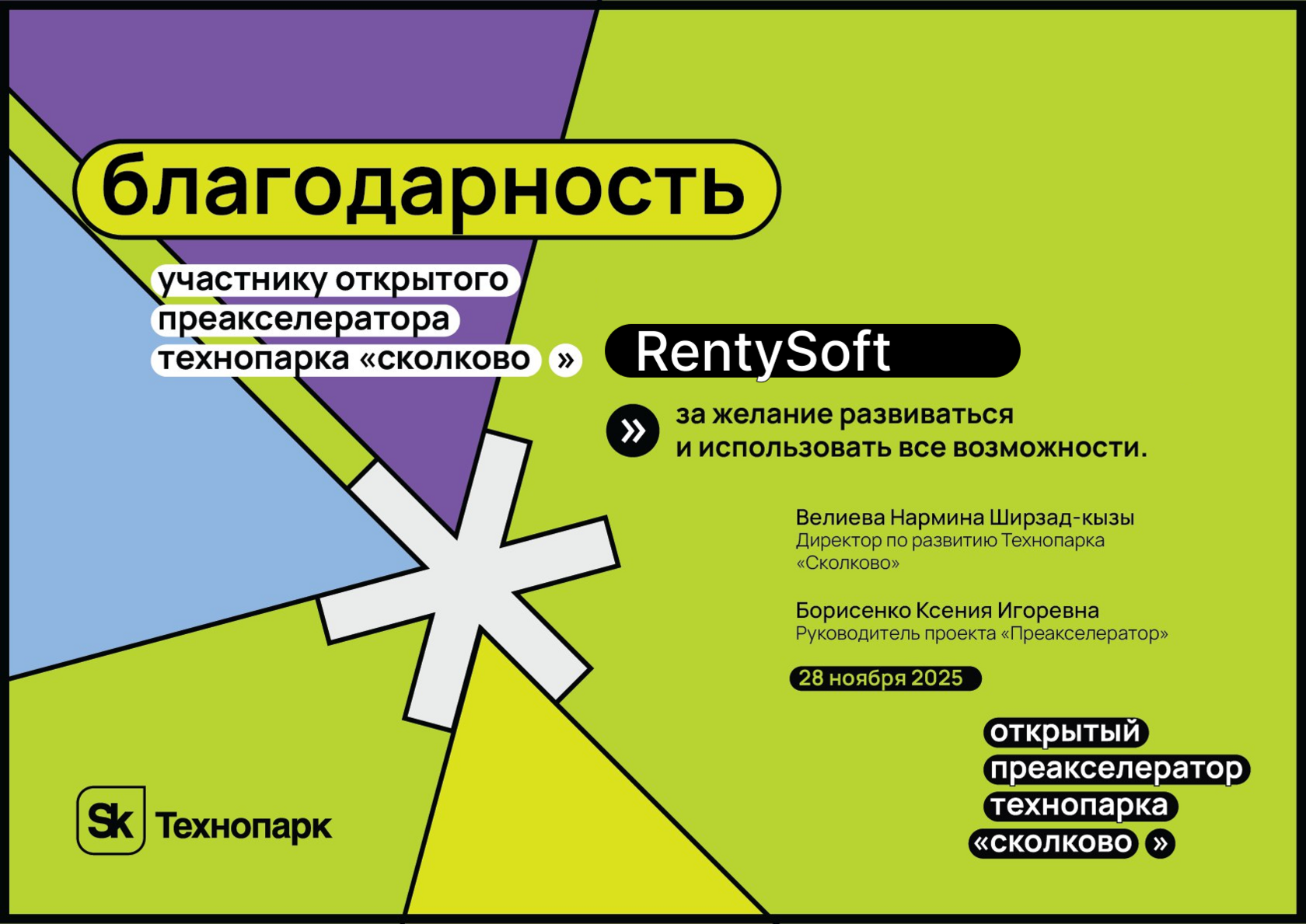 Команда RentySoft прошла обучение в открытом преакселераторе технопарка «Сколково» и получила официальную благодарность за стремление к развитию и активное использование образовательных возможностей программы.